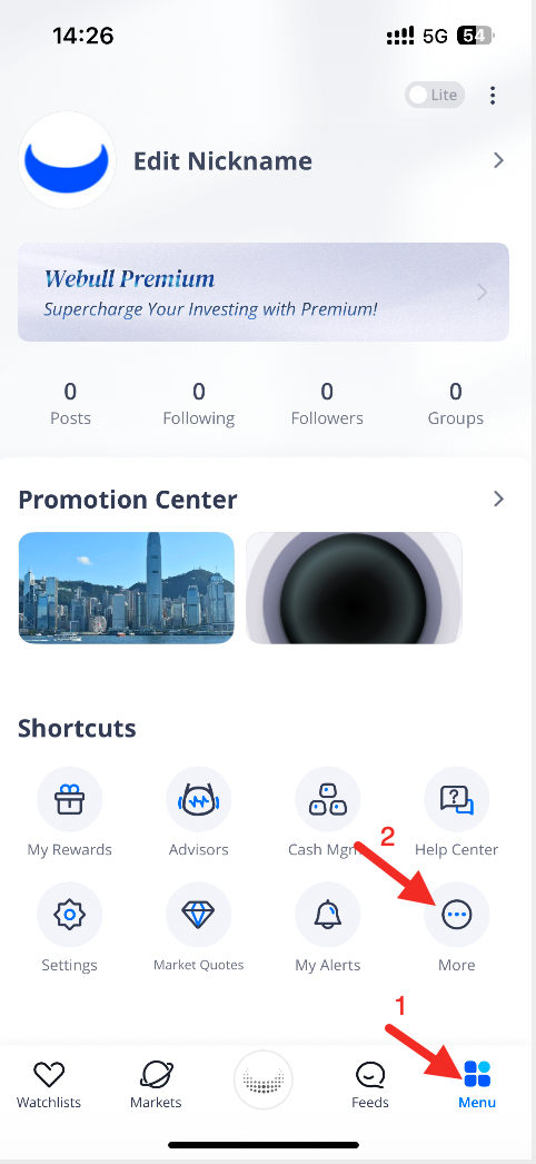 Webull APP,Click sequentially onMenu->More - Click