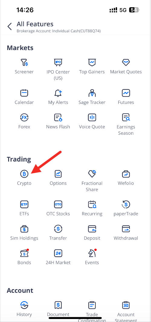 Open Account,follow the App instructions to complete Crypto account opening